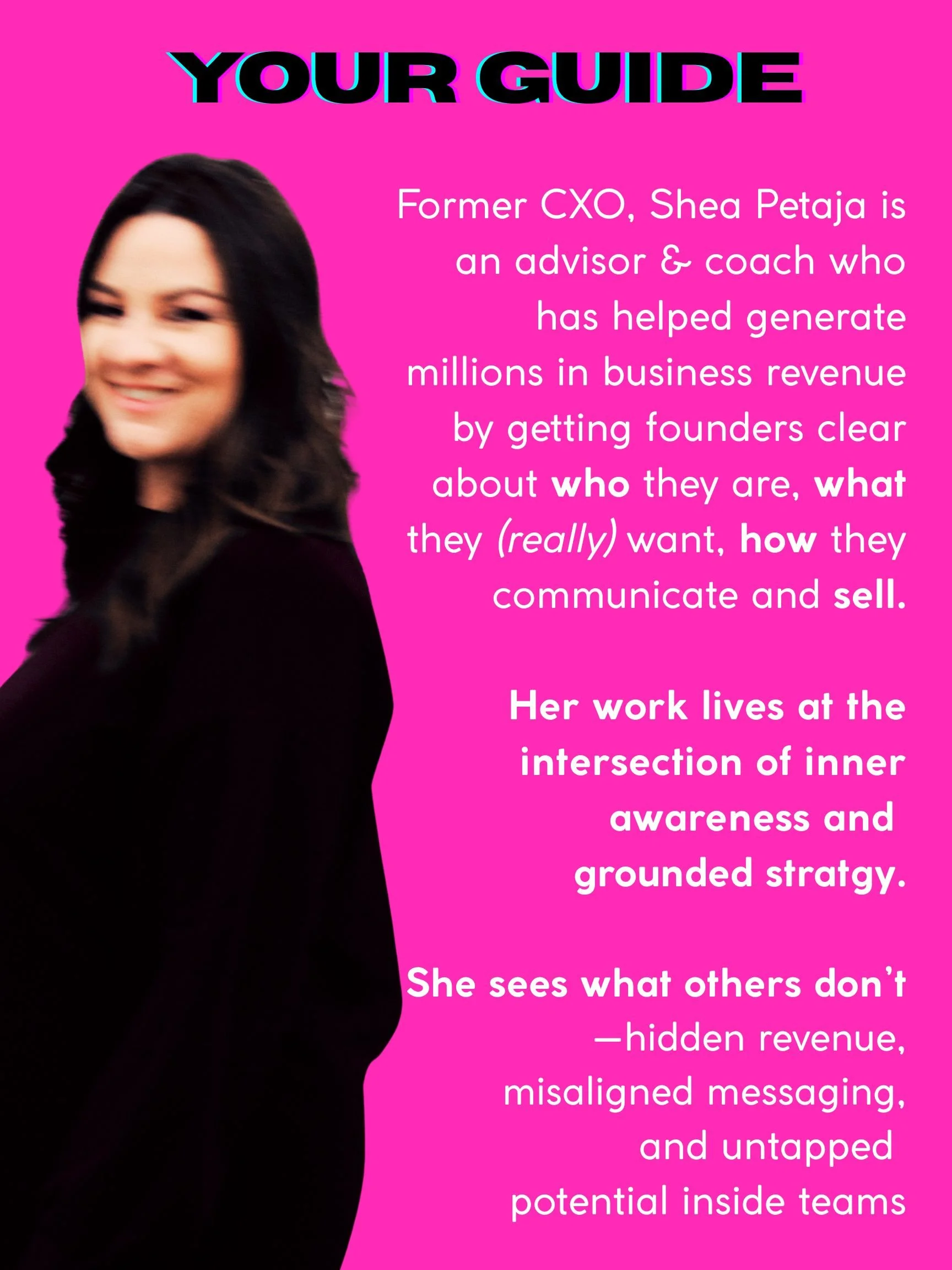 “Shea is amazing! She is intuitive, focused, organized, and empathetic beyond belief. Her insights and ability to see what you don’t see, and assist you through organized and clear methods to discovery of yourself, your business, your goals, etc. is unmatched. Her work is transformative and life changing.